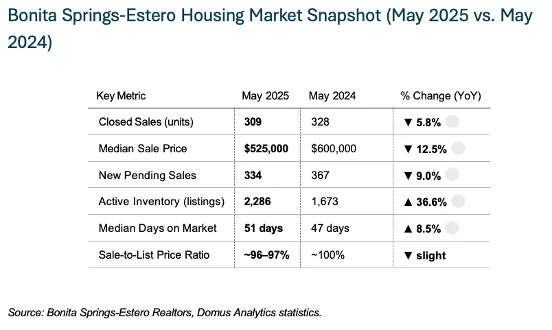 To put the local market snapshot in perspective, below are key Bonita Springs-Estero housing metrics for May 2025 compared to a year prior: